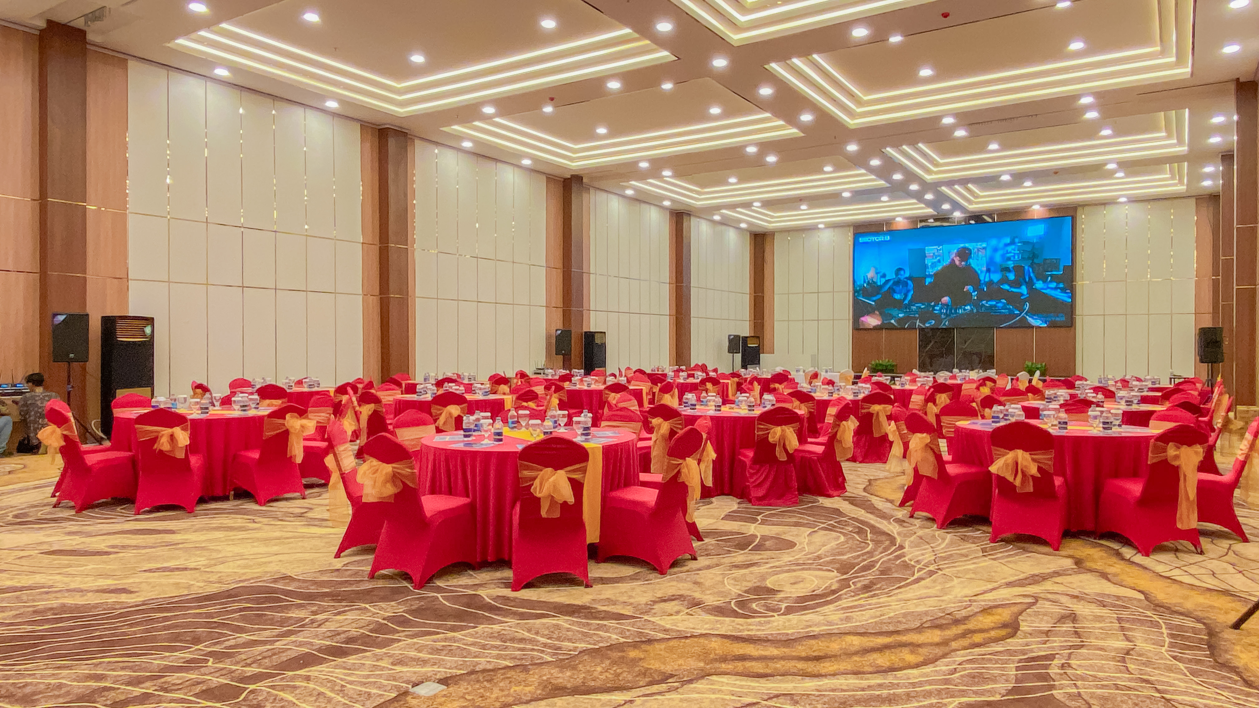 The high ceiling with modern LED lighting creates a bright and warm impression, while a large screen at the front of the room (videotron) supports presentation or entertainment needs. Equipped with a sound system and good acoustics, this restaurant offers a perfect combination of comfort, aesthetics, and functionality for various special events.